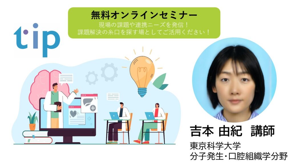 tipより無料オンラインセミナー(TIP BBセミナー)をご案内します。学内およびtip会員(産学官)発の現場の課題や連携ニーズを発信しますので、課題解決の糸口を探す場としてご活用ください!